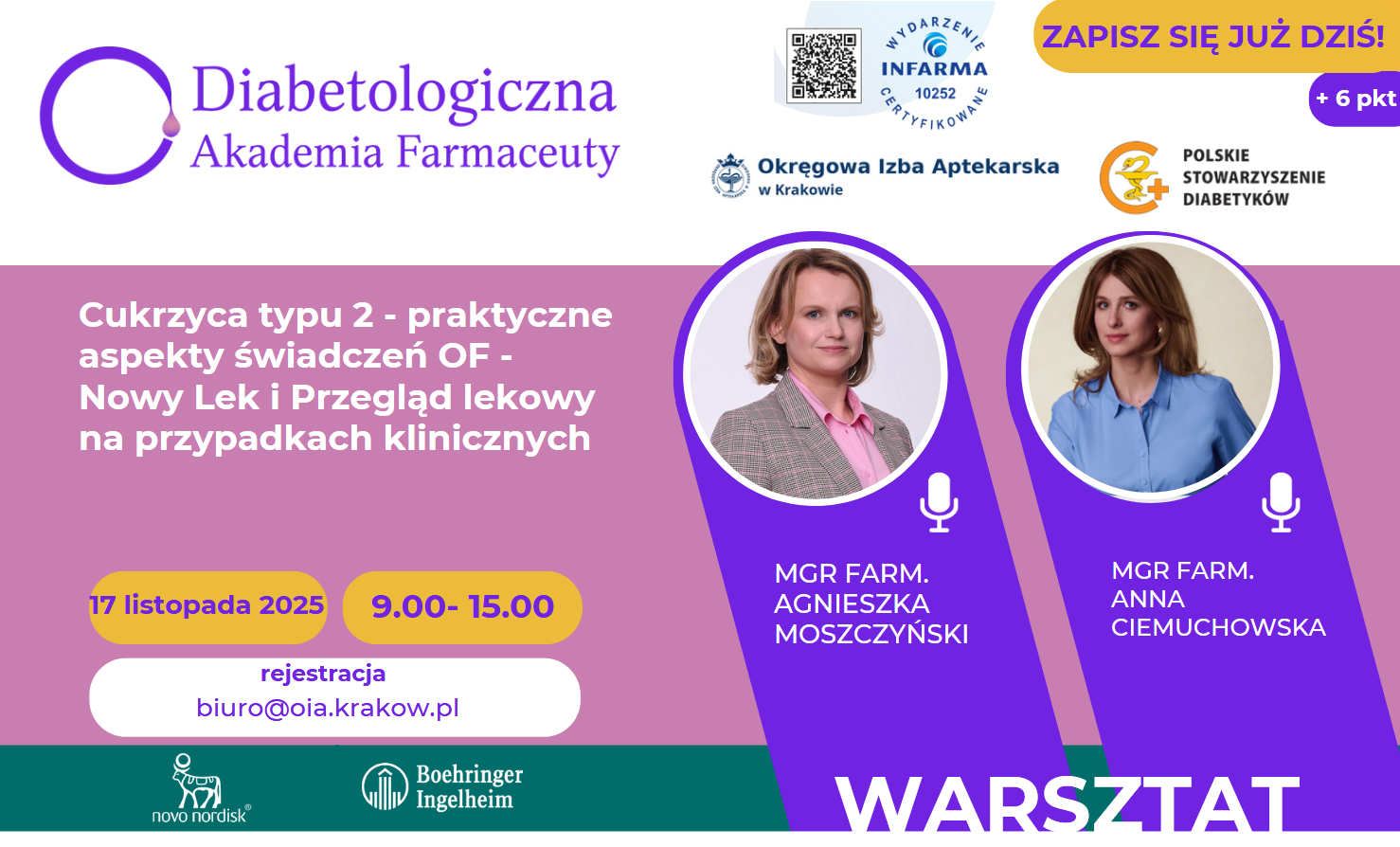 Okręgowa Izba Aptekarska w Krakowie oraz Polskie Stowarzyszenie Diabetyków zapraszają na Warsztat Diabetologicznej Akademii Farmaceuty: