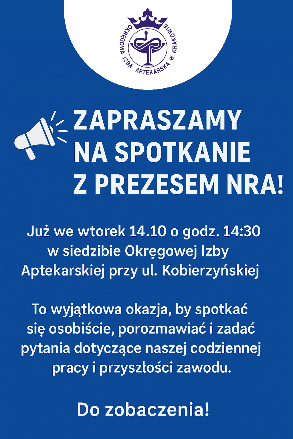 Okręgowa Izba Aptekarska w Krakowie serdecznie zaprasza wszystkich farmaceutów na spotkanie z Prezesem Naczelnej Rady Aptekarskiej, które odbędzie się we wtorek, 14 października 2025 r. o godz. 14:30 w siedzibie OIA przy ul. Kobierzyńskiej 98/68.