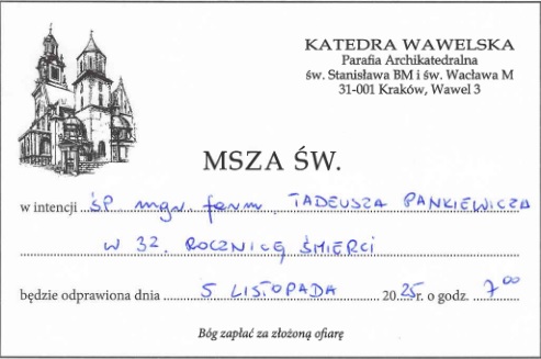 Skan intencji mszalnej zamówionej w intencji Ś.P. mgr farm. Tadeusza Pankiewicza w 32 rocznicę śmierci.